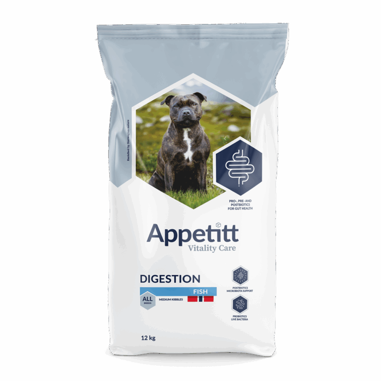 Appetitt Vitality Care Digestion 12 kg har mellomstore fôrkuler tilpasset mellomstore og store hunder. Dette fôret kommer også i 3 kg med små fôrkuler for mindre hunder.